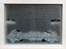 This series is composed of a specific number of letterboxes, corresponding to the pages of the 40 existing letters. These boxes vary in format depending on the original size of the letters, while the glass has in turn been acid etched with the contents of the letters. The nuanced effect of the acid on the glass ensures that the handwriting in the letters, transferred onto the surface of the glass using negatives, is virtually invisible and only appears with lighting. Here the handwriting and the holes of the letters play an important role; they ensure that the contents of the boxes remain diluted and half hidden behind the glass. Through these spaces we focus on the contents of the boxes: objects, photographs and images that refer to the events described in the letters while transporting us to exotic worlds and times past, such as the colonial Victorian era.